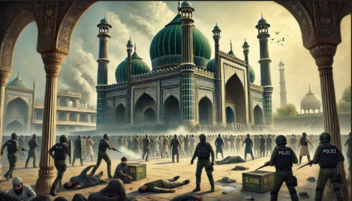 نقاشی از حمله پلیس هند به اقلیت مسلمان در داخل مساجد و اماکن مذهبی آنان