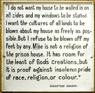 "دوست ندارم خانه ام را دیوارها از هر سو احاطه و پنجره هایم بسته باشند، دوست دارم نسیم فرهنگ تمام سرزمین ها به سوی خانه ام، در آزادانه ترین شکل ممکن بوزد، اما از این که پاهایم از کاری توسط دیگری محروم شوند، گریزانم. ذهن مذهب در یک زندان نیست. اتاقی است برای پذیرایی از مخلوق های جدید خداوند، اما آن خود گواه و دلیلی است در مقابل وقاحت غرور نژادی، غرور مذهبی و غرور رنگ پوست". مهاتما گاندی.