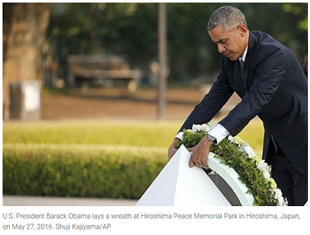 اوباما در حال نهادن تاج گل بر بنای یادبود صدها هزار کشته بمب اتمی بر هیروشیما