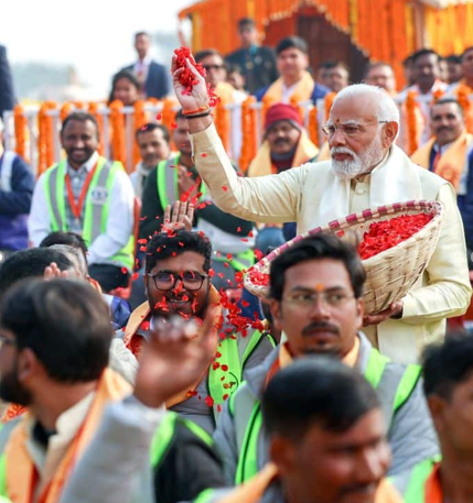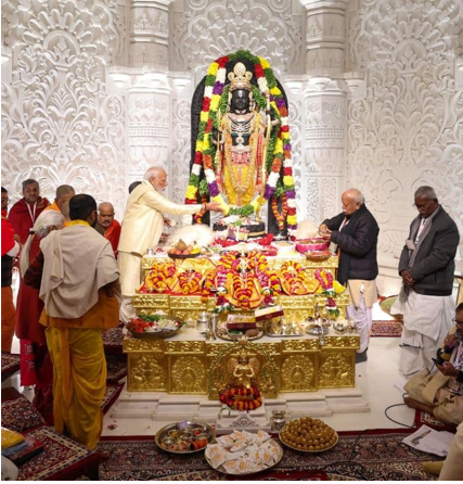 اما با این حال، نخست وزیر در کنار موهان بهاگوات (رئیس گروه RSS از گروه های مادر در بین هندوهای افراطی)، ادیتیانات (سروزیر ایالت اتارپرداش)، آناندیبن پاتل (فرماندار ایالت اتارپرادش) معبد رام در شهر آیودیا در ایالت مهم اتارپرادش، افتتاح کردند. مودی در این افتتاحیه به همراه موهان بهاگوات و ادیتیانات سخنرانی کردند، مراسمی که در ساعت 12 و 20 دقیقه ظهر روز 22 ژانویه 2024 (2 بهمن 1402) آغاز گردید، ابتدا مراسم نیایش انجام پذیرفت، و سپس از مجسمه خدای رام، در داخل معبد، با 130 سانتیمتر ارتفاع، توسط نخست وزیر رونمایی شد و...