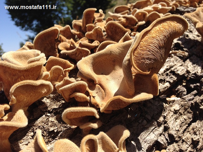 قارچ های زیبای روییده بر یک تنه درخت بر فراز قله ماران