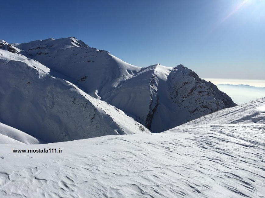 از شیرپلا به بعد، برف خوبی باریده و برف در مسیر و دره ها قابل توجه است، و این مسیر را بدون توقف قابل توجهی یکسره طی کردیم، شیب ها ترسناک و برف پودر شده، نشان از سردی هوا و دمای نزدیک به شش درجه زیر صفر دارد، و باد در قله تقریبا 15 کیلومتر سرعت دارد، که این پودر سفید را از یال ها جاروب کرده و به دره ها منتقل، و جمع می کند، گروه های نسبتا زیادی با ما همنوردند، هوا کاملا صاف و آسمان کاملا آبی است. در حالی که تهران در آلودگی ها و بخار و مه خود غرق است، اینجا هوا صاف و تمیز است.