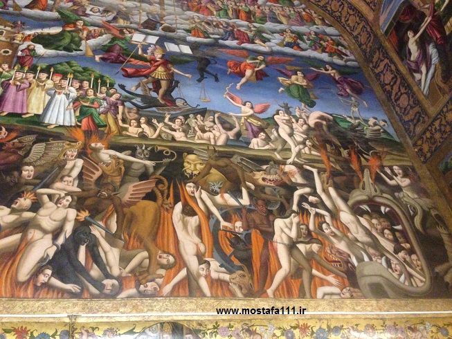 نقاشی های داخل کلیسا را هم می توان گفت، انگار تفسیر آیات عذاب در قرآن است، که تصویر کشیده شده اند؛ در ردیف پایین این آثار بسیار زیبا؛ یک رشته نقاشی است، که به داستان اولین کسانی اشاره دارد که در منطقه خود، به دین جدید گروند، و بدین لحاظ تحت شکنجه و هزار مصیبت توسط دین و قدرت حاکم زمان، دچار شده و هر آنچه از اعمال غیر انسانی و غیر اخلاقیست، بر چنین نو کیشی روا داشته می شود، چرا؟! چون از دین رسمی و غالب وقت، خارج شده، و روش دیگری را برای ستایش و شناخت خداوندگار خود، انتخاب کرده است.