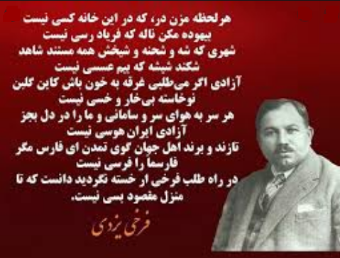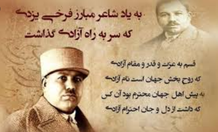 [3] - میرزا محمد فرخی یزدی ملقب به تاج الشعرا (۱۲۶۸ خورشیدی – ۲۵ مهر ۱۳۱۸) شاعر و روزنامهنگار آزادیخواه و دموکرات صدر مشروطیت است. وی سردبیر نشریات حزب کمونیست ایران از جمله روزنامه طوفان بود. او همچنین نماینده مردم یزد در دوره هفتم مجلس شورای ملی بود و در زندان قصر به دست پزشک احمدی و به دستور رضاخان کشته شد. مدفن او ناشناخته است.