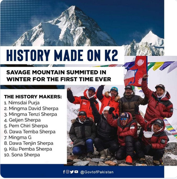16 ژانویه 2021 برابر با 27 دیماه 1399 تیم کوهنوردی شرپا (Sherpa) از کشور کوچک نپال برای اولین بار در تاریخ کوهنوردی جهان، توانست در میانه زمستان پای بر بلندای K2 وحشی و تسخیر ناپذیر نهد.
