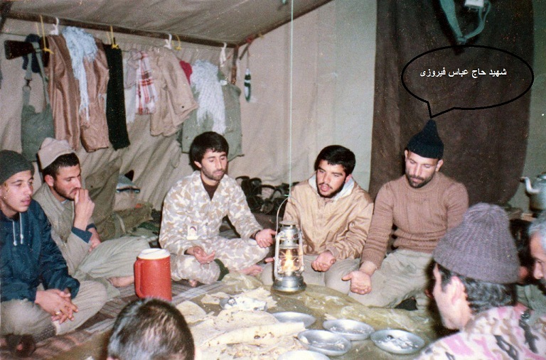 شهید حاج عباس فیروزی بر سر سفره در چادر رزمندگان در حال دعای سفره