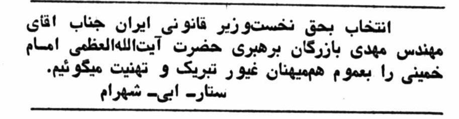 "انتخاب بحق نخست وزیر قانونی ایران جناب اقای مهندس مهدی بازرگان برهبری حضرت آیت الله العظمی امام خمینی را بعموم هم میهنان غیور تبریک و تهنیت میگوئیم. ستار- ابی – شهرام [2] "