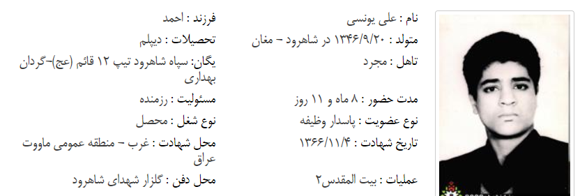 پاسدار وظیفه شهید علی یونسی، فرزند احمد، ولادت 1346، شهادت 4/11/1366 که در منطقه عملیاتی نصر 8 ماووت عراق به خیل شهدا پیوست. گفتا به ره عشق سفر باید کرد ره پر زحرامی و خطر باید کرد یا عشق سفر زسر بدر باید کرد یا در ره دوست ترک سر باید کرد