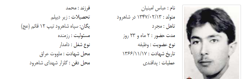 بسیجی شهید عباس امینیان فرزند محمد، ولادت 1347، شهادت 17/11/1366 که در منطقه عملیاتی بیت المقدس 3 ماووت عراق به فیض عظمای شهادت نایل گردید. آنان که شهید راه توحید شدند سرچشمه نور همچون خورشید