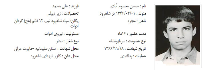 پاسدار وظیفه شهید حسین معصوم آبادی فرزند محمد علی، ولادت 1346، شهادت 18/11/1366 که در کربلای ماووت عراق به خیل عظیم شهدا پیوست، به راه دین و قرآنم فداکردم جوانی را، به آگاهی پسندیدم بهشت جاوانی را، بگو بر مادر خوبم شهید هرگز نمی میرد، ره عشق و شهادت را ز مولایم علی گیرم.