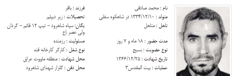 بسیجی شهید محمد صادقی فرزند محمد باقر، ولادت 1334، شهادت 25/12/1366 که در منطقه عملیاتی بیت المقدس 3 ماووت عراق به سوی معبود خویش پرواز کرد. قسمتی از وصایای شهید "شما امت حزب الله پاسدار خون شهیدان هستید و از انقلاب اسلامی و جمهوری اسلامی و ولایت فقیه حمایت کنید و بدانید که این انقلاب ثمره خون صدها هزار شهید، مفقود و معلول است و مستضعفین جهان چشم امید به این انقلاب دارند."