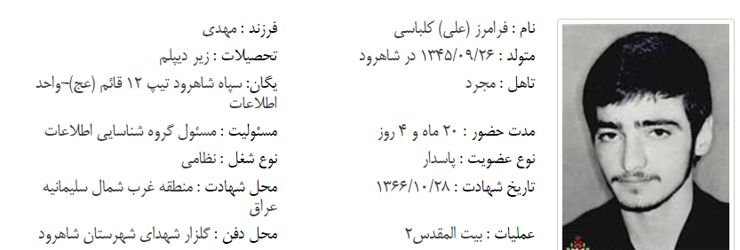 شهید فرامرز کلباسی، که در جبهه ما او را "علی" صدا می کردیم، از شهدای گرانقدر واحد اطلاعات و عملیات تیپ 12 قائم آل محمد بودند، متولد 1345 و چهار سالی از من بزرگتر بود، فرزند مهدی که در تاریخ 28/10/1366، در منطقه عملیاتی بیت المقدس 2 واقع در منطقه عمومی شهر ماووت کردستان عراق، در منطقه ایی نزدیکی های شهر سردشت خودمان (بیژوه) به شهادت رسید، قسمتی از وصیت این شهید " امیدوارم خون جاری شده من بتواند تحرکی به جسم کسانی که هنوز در خواب هستند باشد" علی آقای کلباسی از نیروهای فعال واحد اطلاعات و عملیات تیپ 12 بود، که بارها تا مرز شهادت پیش رفته بود، اما قسمت او این بود که بیش از بیست ماه در جنگ زنده بماند تا بیاید و در منطقه شمالغرب و در میان کوه های استوار کردستان عراق به شهادت برسد، ایشان ورزشکار و از رزمی کاران شهرمان بود، دارای کمربند مشکی با درجه "دان یک" ، که علیرغم قدرت جسمانی بالایی که داشت، واجد اخلاقی بسیار نیکو بود و وقتی ما برای نبرد کربلای 4 در خرمشهر حاضر شده بودیم، تا خود را برای این عملیات آماده کنیم، و در ساختمانی دوقلو در کمربندی این شهر ساکن شده بودیم، این شهید بزرگوار مدتی به درخواست دوستان کلاس دفاع شخصی هم گذاشت و چند جلسه ایی هم تمرین داشتیم، ولی با شروع کارهای جدی جنگ، این کلاس ها تعطیل شد، او در همین عملیات باید جزو غواص هایی می شد که در اثر لو رفتن عملیات، باید اسیر و به شهادت می رسید و... اما فنون رزمی این جوان رشید به کمکش آمده بود و در حالی که از ناحیه پا مجروح شده بود، توانسته بود از دام دشمن گریخته و به نزد ما باز گردد، دشمن درست روی پای او شلیک کرده بود، ولی علیرغم مجروحیت توانسته بود از دست دشمن فرار کند، و به همین دلیل برای مدت ها با عصا در جنگ حضور داشت و قصد بازگشت به پشت جبهه را نداشت، و زمان مجروحیت هم در جبهه بود تا همانجا زخم پای مجروحش ترمیم یافت، در حالی که نشست و برخواست برایش بسیار مشکل بود و به کم دو عصا می توانست حرکت کند. این هم فرازی از مناجات شهید فرامرز کلباسی (http://shohadaye-shahroud.blogfa.com/1391/08) : "به نام او که نسیم غفرانگر رحمتش نوازشگر قلب توبه کاران است آنها را از جهنم سوزان بسوی نعیم رضوانش می کشاند. خدایا ! شهادت مرا در بالاترین درجه ی شهادتها قرار بده. خدایا ! در این شب جمعه که در رحمتت باز است از تو می خواهم که در این عملیات ، افتخار شهادت را نصیب من گردانی. خدایا ! من با همه ی جرم و خطاهایم خجالت می کشم ، تو مرا خواندی بیایم. خدای من ! من مستحق آتشم ، من توبه هایم را شکستم ، بد کردم ، نفهمیدم. خدایا ! نکند فردای قیامت مرا به طرف جهنم ببرند مولایم حسین نگاه می کند دست خالی مانده ام."