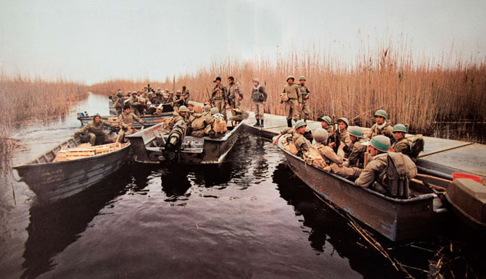 عده ایی از رزمندگان سوار بر قایق ها در منطقه هور