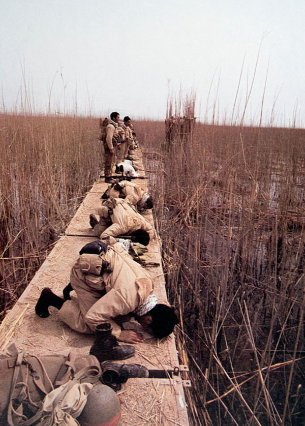 عده ایی از رزمندگان روی پل های شناور در هور
