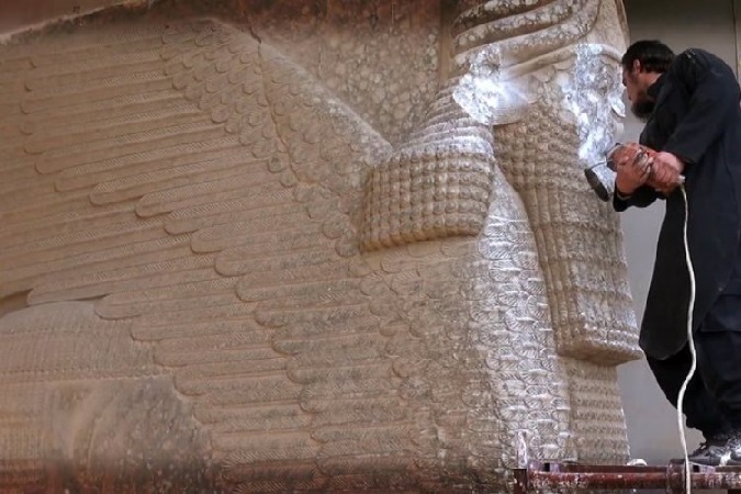 یک عنصر داعشی در حال خراب کردن آثار باستانی تمدن پارسی در شهر هترا