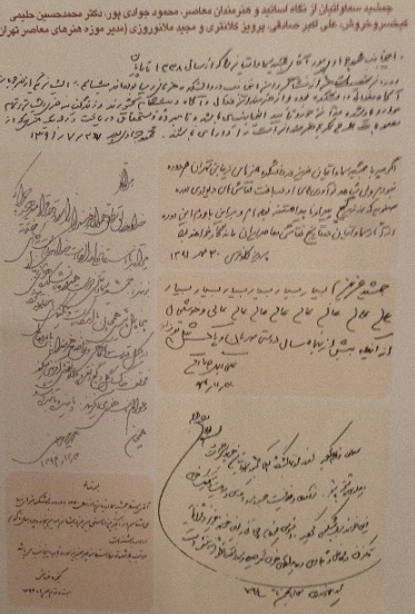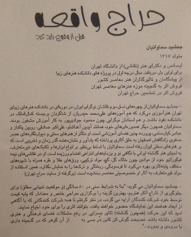 خود استاد هم از فروش چندتا از آثارش که حامل خاطرات زیادی برای ایشان بود صرف نظر کردند. این استاد بزرگ زیر اثر شماره 27 خود که در این حراج قیمت پایه آن چهار میلیون تومان قیمت گذاری شده بود و با قیمت 500 هزار تومان آغاز و به دو میلیون فروش رفت نوشته بودند: من آن نیم که زبونی کشم از چرخ زبون چرخ برهم خورد ار وفق عدالت نشود "من و حافظ"
