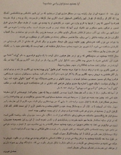 این حادثه (و چنین حوادثی به اشکال مختلف)، زیر پوست زبر و خشن همین شهر ما، تهران و در کُنج خلوت یک گالری کوچک و در جمع تعداد اندکی از خریداران و تماشاچیان، زمانی به حراج رفت که رهبران جناح های سیاسی کشور در اوج قدرت و در عین حال نفرت از همدیگر، به قهر و نبردهای خشن سیاسی خود، فارغ از احساس نیاز به آرامش در کشور، و حل مشکلات آن ادامه می دهند، و اگر یک طرف هم برای کشور احساس خطر کرده و تقاضای آتش بس هم کند، طرف دیگر از این می ترسد که نکند که در سایه آشتی ملی و یا حتی گفتگو، وسعت عمل سیاسی خود را از دست داده و یا قسمتی از آن را به رقبای خود واگذار کند، و فضا کمی به طرف مقابل هم تعلق گیرد، و جا برای دوستان همجناحی اش تنگ شود؛ و یا با گفتگو و آشتی فضای گِل آلود و دوقطبی شدید و کینه توزانه فعلی، رو به آرامش رود، و ماهیگیران ناشی و بی مقدار سیاسی آنان که در فضای رقابتی و سالم و برابر، با حضور همه مردان و زنان این عرصه در دو جناح، توان هنرنمایی و رزمیدن مردانه را ندارند، تنها می توانند ماهی های بزرگ و قیمتی را در یک رقابت ساختگی و مصنوعی با شرکت شرکا و دوستان خود، خندان و بشّاش، از این آب گل آلود، بدون زحمت و تخصصی خاص، کسب و در کیسه خود و جناح شان وارد نمایند. لذا در حالی که اینان هرگونه نرمش و کوتاه آمدنی را لازم ندیده، و سوارند و می تازند، این مردم و چنین هنرمندان و فعالین دیگر عرصه ها زیر چرخ سنگین این رقابت های ناسالم له می شوند و کاری از دست کسی ساخته نیست، و دلسوزان تنها می توانند بنشینند و پوست کلفتی کرده و ببینند که کدام چاله ایی این اسب چموش قدرت و سوارش را نقش بر زمین خواهد کرد، و متاسفانه سرمایه این انقلاب و کشور که در توبره این اسب، با خود دارند، چگونه ضایع و ناکار شده، و به هدر داده خواهد شد، و فرصت های طلایی این کشور و مردم مظلومش را یک به یک به نابودی خواهد برد.