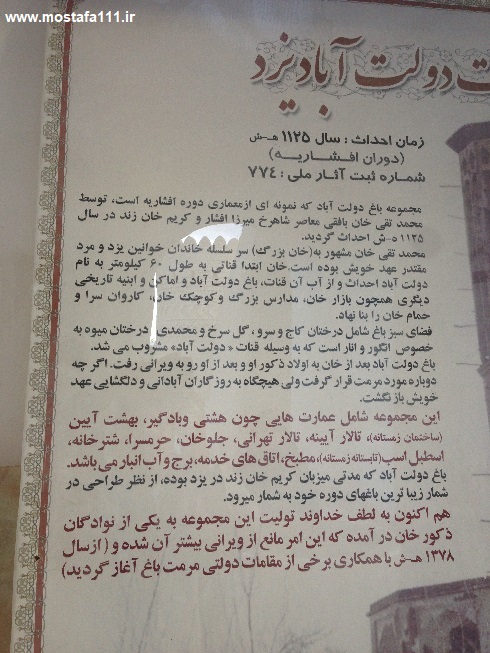 از آنجا که من مشابه ایرانی اش را قبل از این سفر در ایران ندیده بودم، همواره برایم این سوال وجود داشت، که کدام باغ ایرانی مثل این باغ های با شکوه و زیباست که من ندیدم، ما خود باغ داریم و چنین باغی را در ایران ندیده ایم، تا این که امروز وقتی پا به باغ دولت آباد شهر ایساتیس [2] گذاردم، فهمیدم که چرا، چگونه و از کجا باغ های ایرانی به هندوستان راه یافته و شهرت جهانی دارند، و دیگران از کجا باغ های خود را از روی آن کپی زده و ساخته اند؛ آن روز که در نزدیکی های شهر اگرا در ایالت اتارپرادش هند، تاج محل را دیدم و از باغ ایرانی شنیدیم و یا در توصیف بنای باغ - مقبره اکبرشاه گورکانی در "پنج سکندر" [3] و یا سیکندرا از شکوه و عظمت باغ ایرانی شنیدم، امروز اصالت این باغ ها را در باغ دولت آباد یزد دیدم، باغی زیبا با ساختمان های متنوع و چهارفصل؛ باغ دولت آباد را که ببینی، متوجه می شوی چه کسانی فرهنگ ایران را به هند بردند، و مقبره همایون در دهلی را از روی الگوی بناهای کدام شهر ایران ساخته اند، معمارهایش از سبک و روش کدام نوع باغ های ایران الگوبرداری کرده اند.