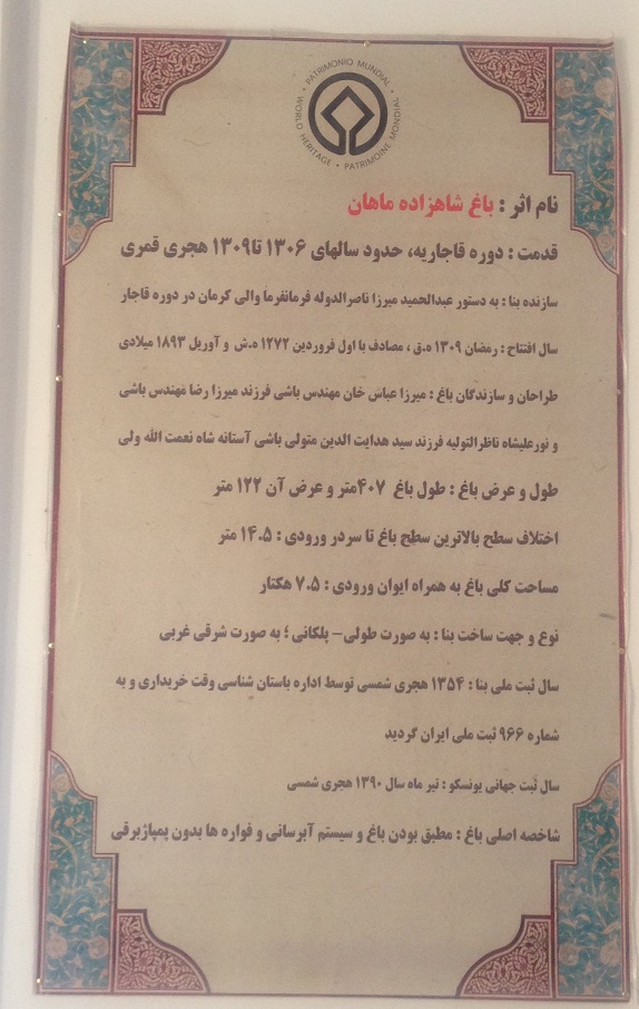 گرچه در این سفر توانستیم فرصت دیدار از این باغ را که در آخرین ساعات حضور در ماهان و با عجله در ساعات پایانی سال 1396 رقم خورد، را بدست آوریم، ولی خیلی نتوانستیم با عارف نامی ایران زمین، عارف اهل شریعت جناب شاه نعمت الله ولی بمانیم، بدون معرفت کافی به این شیخ المشایخ عرفان، خود را بدانسوی جاده اصلی کرمان – بم رسانده تا به دیدار باغ شاهزاده و یا همان باغ "شازده" برویم [2]