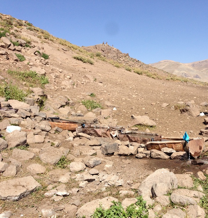 ساعت 10 و 50 دقیقه به چشمه ایی که هنوز هم آب داشت (ارتفاع 3230 متری)، و آبی ذلال که از سردی نمی شود دست در آن فرو کرد، رسیدیم که محلی ها به آن چشمه "تَرازان" می گویند و گزارشات کوهنوردی از آن به نام "چشمه اصلی" یاد کرده اند. کمی آب خوردیم و آب ظرف های خود را که از ته دره کرکبود برداشته بودیم را با آب این چشمه تعویض کردیم، و برای شناسایی مسیرهای منتهی به سات به جلو و در سمت شمال راه افتادیم، تا اینجا چیزی حدود هفت و نیم کیلومتر صعود داشتیم. اینجا گوسفند سرایی است که هنوز دایر است و چوپانان وسایل خود را در سنگ چینی قرار داده و رفته اند، فضولات گوسفندان و سنگ نمک های حاضر در محل نشان می دهد که برای مدت زیادی گوسفندان اینجا اطراق می کنند و چنین جاهایی مناسب برای ماندن کوهنوردان نیست، و باید سریع آنجا را ترک کرد زیرا معمولا بدن گوسفندان دارای حشراتی است که چنانچه وارد بدن و لباس ما شوند تا مدت ها باعث اذیت و آزار بدن خواهند شد، از جمله این حشرات می توان به کک (Flea) و کنه (Tick) اشاره کرد، لذا می توان به کوهنوردان توصیه کرد که در شبمانی ها نقاطی که گوسفندان اقامت دایم و یا موقت طولانی دارند مناسب نیست و سریع باید چنین مکان هایی را ترک کرد.