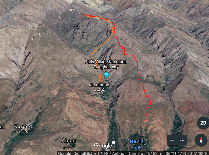 ساعت 5 و 55 دقیقه صبح که هنوز هوا تاریک بود و امکان حرکت تنها با "هدلایت" میسر بود، از روستای کرکبود کار صعود خود را آغاز کردیم، برای اجرا چنین صعودی از این مسیر، باید آبشار [2] دیدنی کرکبود را دور زد، زیرا امکان عبور بدون تجهیزات از دهانه آبشارِ مذکور وجود ندارد.