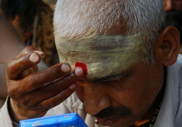 تزیینات خاکستر و زنگ مقدس بر پیشانی روحانی هندو