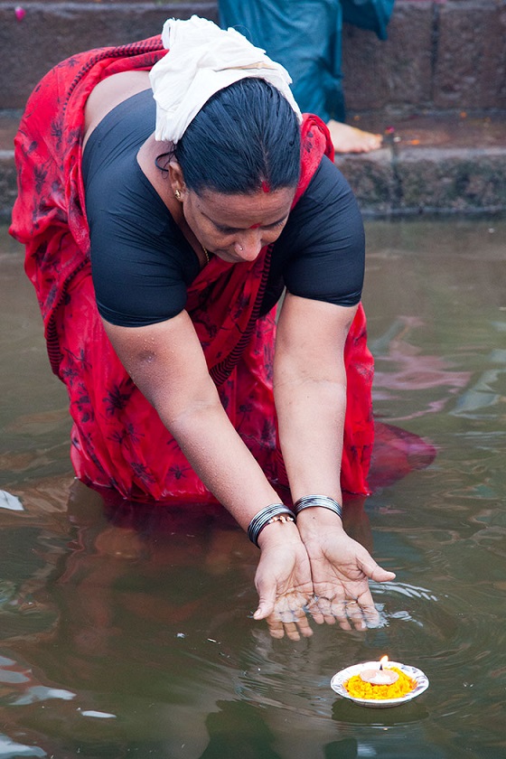 خانم هندو در حال رها کردن آتش مقدس در آب مقدس