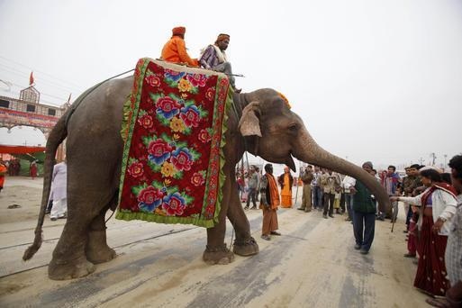 فیل مقدس توسط زایرین پذیرایی می شود