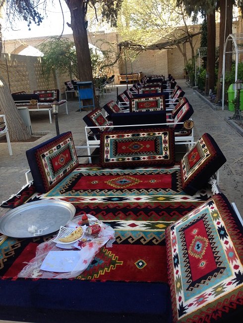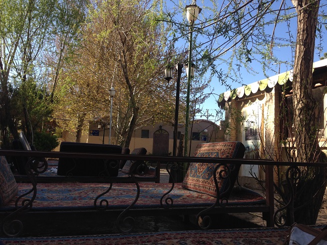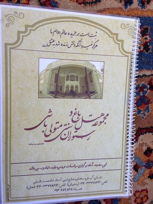 و ما در حالی که موسیقی اصیل ایرانی و با اشعاری عرفانی را از بلندگوی رستوران روباز می شنیدم، موسیقی هایی که شهرتی نداشت و برای اولین بار بود که آنرا می شنیدم، از این منو، غذای خود را انتخاب و فوری سفارش دادیم و به انتظار نشستیم، تا برسد، میهمانانی هم بودند و می آمدند و بعضی انگار می خواستند سال کهنه را با نو در در کنار مقبره شاه نعمت الله ولی تحویل کنند، سبزه (و لابد سفره هفت سین) به دست می آمدند تا در این هتل سنتی و زیبا لنگر بیندازند، و اتراق کنند، و ما عکس های این هتل زیبا را که در منواش آمده بود، زیر و رو می کردیم و در حالی که روده کوچیکه، بزرگه را می بلعید، بالاخره خدمه غذا را آوردند، ولی آنقدر غذای بی کیفیتی بود که نگو، برکت خدا را به بدترین وضع پخته بودند،که هرگز تناسبی بین ساختمان رستوران، با خدمه فعال و مودب، جایگاهش در کنار این عارف نامی و کیفیت غذای آن نبود، و گرچه ما متنوع سفارش داده بودیم، هیچکدام از غذا و کیفیت اش راضی نبودند، حال آنکه گرسنه بودیم و به قول قدیمی ها "آدم گرسنه سنگ را هم می خورد" و یا "چک تبری [4] را به جای نان می بلعد"، ولی چاره ایی نبود، و ما این غذای بی کیفیت را لاجرم در معده خود به ضرب نوشابه و... ریختیم، و سریع رستوارن را که مثل یک "عروس بزک کرده" و به واقع بدذات بود، را ترک کردیم، اما این بیت شعر حافظ که در ته فیش غذای ما در این رستوارن تحت مبحث "امروز با حافظ" آمده بود، را نفهمیدم که گفته بود: